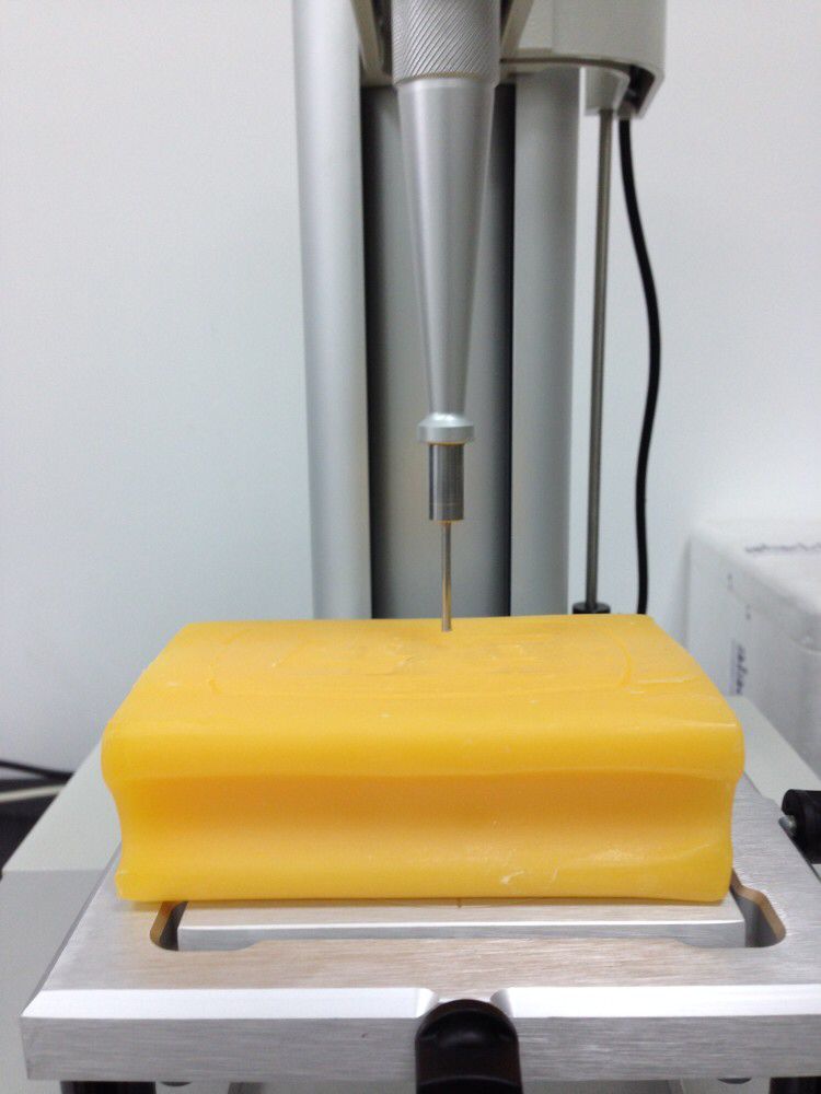 将样品放在针形探头的正下方并开始穿透测试。如果所测试的样品放置在一个容器里(建议在标准方法),则建议进行四次试验,样品测试点大约间隔同样距离(不得少于12.7毫米),测试点距离容器边缘要大于3.2毫米。最大的力是表示探头要穿透样品某一距离时受到的力,最大力越大,硬度越大。