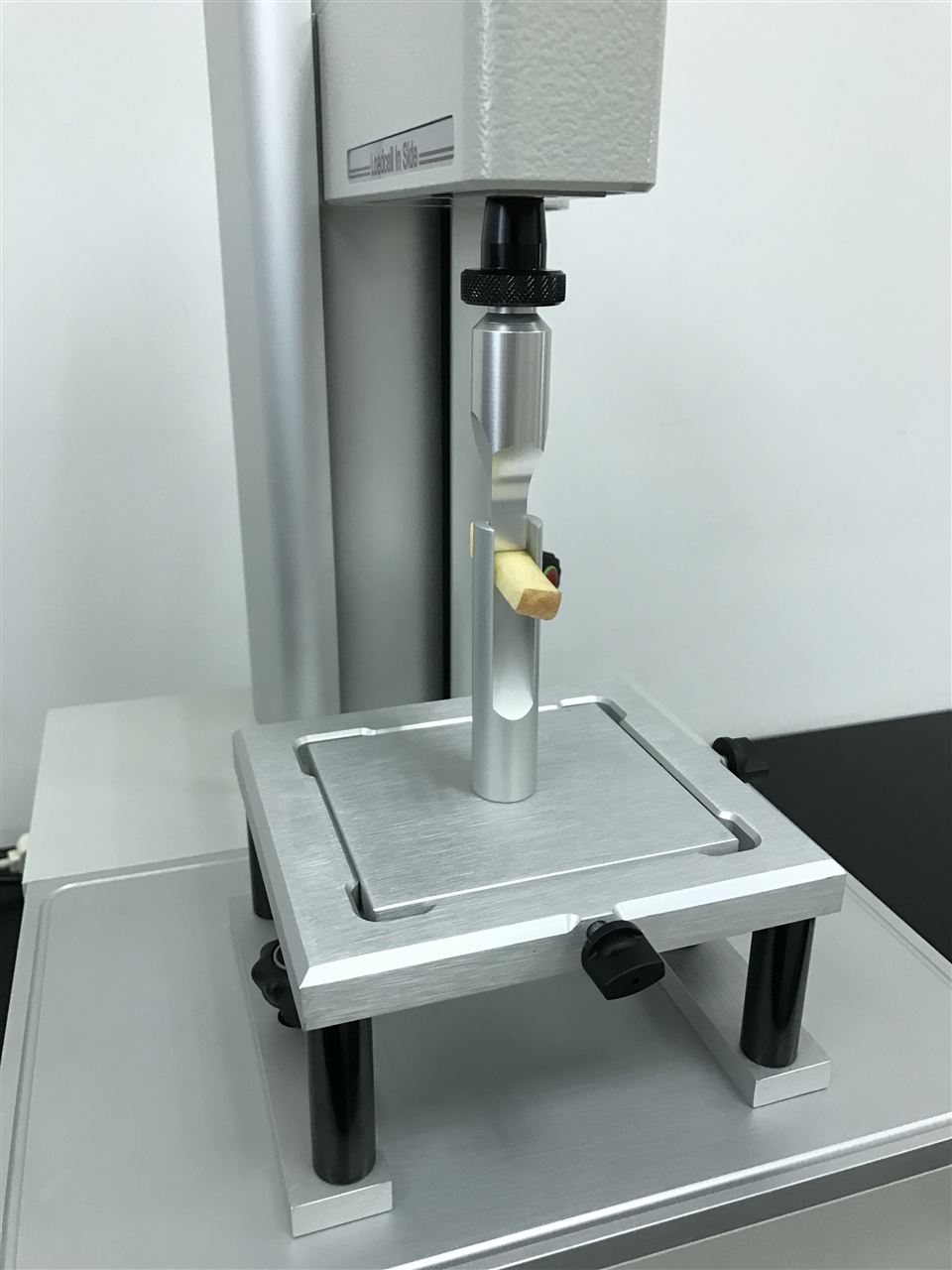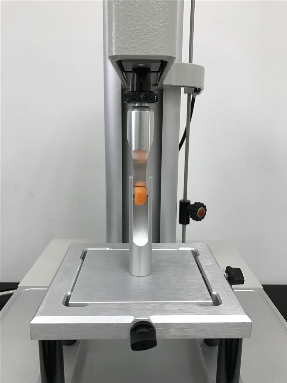 (6)P/VB钳口探头:该装置可进行模拟人的大门牙咬断食物的测试,样品放在下钳口内,咀嚼动作由上钳口撕裂食物的下压动作测试;适用于果蔬的剪切或韧性、柔软度,并可对生熟食品的纤维度进行测试。