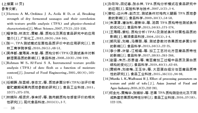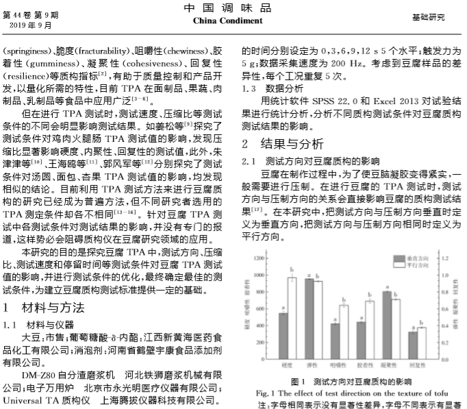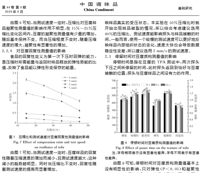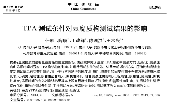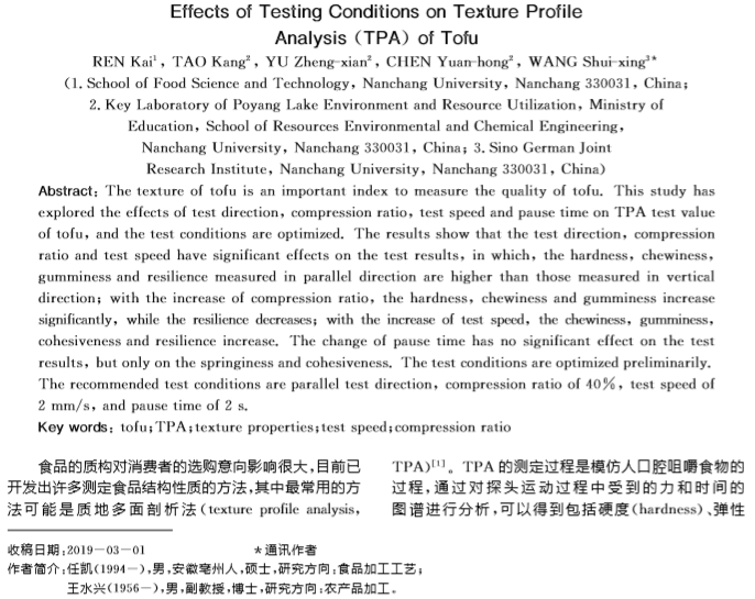 2019年9月,《中国调味品》期刊在线发表了南昌大学题为“TPA测试条件对豆腐质构测试结果的影响”的文章,在文章中,研究人员使用上海腾拔Universal TA质构仪测定豆腐的硬度、弹性、回复性、咀嚼性等指标。
