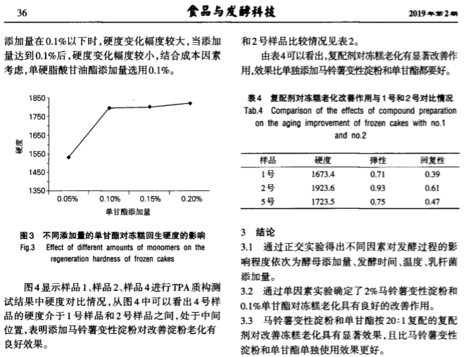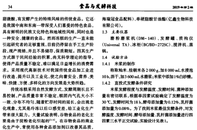 2019年,《食品与发酵科技》期刊在线发表了四川省食品发酵工业研究设计院题为“传统冻糕工业化生产技术研究”的文章,在文章中,研究人员使用上海腾拔Universal TA质构仪测定传统冻糕的硬度、弹性、回复性等指标。