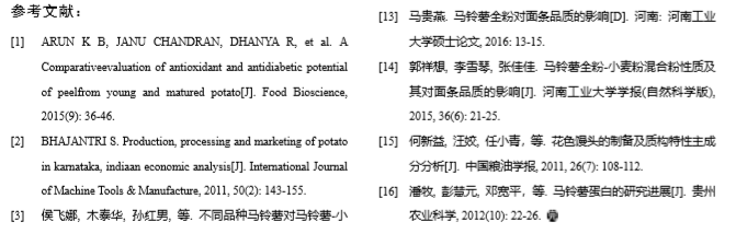 摘 要: 为了探讨马铃薯全粉对面条品质的影响,通过测定添加不同比例马铃薯全粉的面筋特性、蒸煮特性、质构特性和感官评价,并结合主成分分析进行综合评价。结果表明:随着马铃薯全粉添加量的增加,面条色泽呈暗红趋势变化,其面筋含量逐渐降低;面条的蒸煮特性、质构特性及感官品质呈现先增加后降低的趋势,说明适量添加马铃薯全粉可以在一定程度上提高面条的食用品质。应用主成分分析法对不同马铃薯全粉添加量的面条进行研究,确定了反映面条品质的3个主成分因子,3个主成分的累积贡献率达到88.35%。