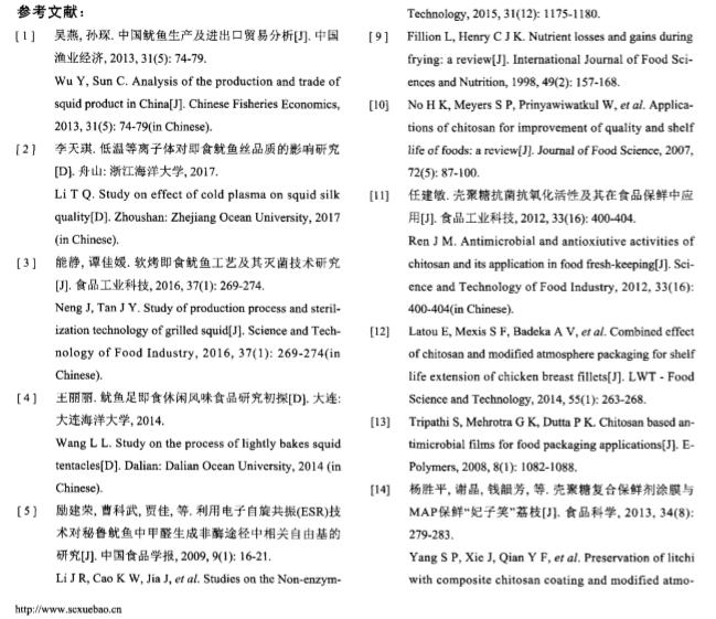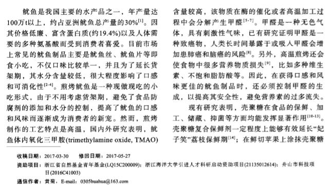 摘要 :为减少煎烤鱿鱼在制作过程中的营养损失和 甲醛的生成。实验采用2g/L的壳聚糖 溶液( 普通壳聚糖和羧甲基壳聚糖) 浸泡处理新鲜 巨型枪乌贼( 秘鲁鱿鱼) 5mi n,再进行高 温煎烤。甲醛检测的结果显示,煎烤后对照组( 纯水浸泡) 、壳聚糖组、羧甲基壳聚糖组 鱿鱼中的甲醛含量分别为45.56、4.79、8.3 0mg/kg,各组之间差异极显著。煎烤前后鱿鱼 中几种营养素的检测结果显示,壳聚糖组中天冬氨酸、丝氨酸、脯氨酸、胱氨酸、赖氨 酸、十二酸、十五酸、十七酸、十八碳烯酸( n =9 ) 、十八碳烯酸( n =6 ) 、亚油酸( n =6 ) 、二 十碳烯酸( n =9 ) 、二十碳二烯酸、二十碳 四烯酸、二十碳五烯酸( EPA) 、二十二碳五烯酸 ( n =3 ) 及元素Mg、P、Mn和维生素C含量高于对照组,其他营养素含量较对照组低。羧 甲 基壳聚糖组中天冬氨酸、丝氨酸、甲硫氨酸、亮氨酸、赖氨酸、组氨酸、十四碳烯酸、十五酸、十六碳烯酸( n =7 ) 、十七酸、花生烯酸( n=9) 、二十碳二烯酸、二十碳四烯酸、二十碳五烯 酸( EPA) 及 元素K、Mg、P、Zn、Mn、Se和 维生素B含 量高于对 照组 ,其他 营 养素含量较对照组低。另外,EPA及7种人体必需氨基酸在壳聚糖组的含量高于羧 甲基 壳聚糖组。研究表 明,2种壳聚糖均能有效抑制鱿鱼在煎烤过程中甲醛的生成,普通壳 聚糖效果更显著,并且能较好地保持鱿鱼的品质。