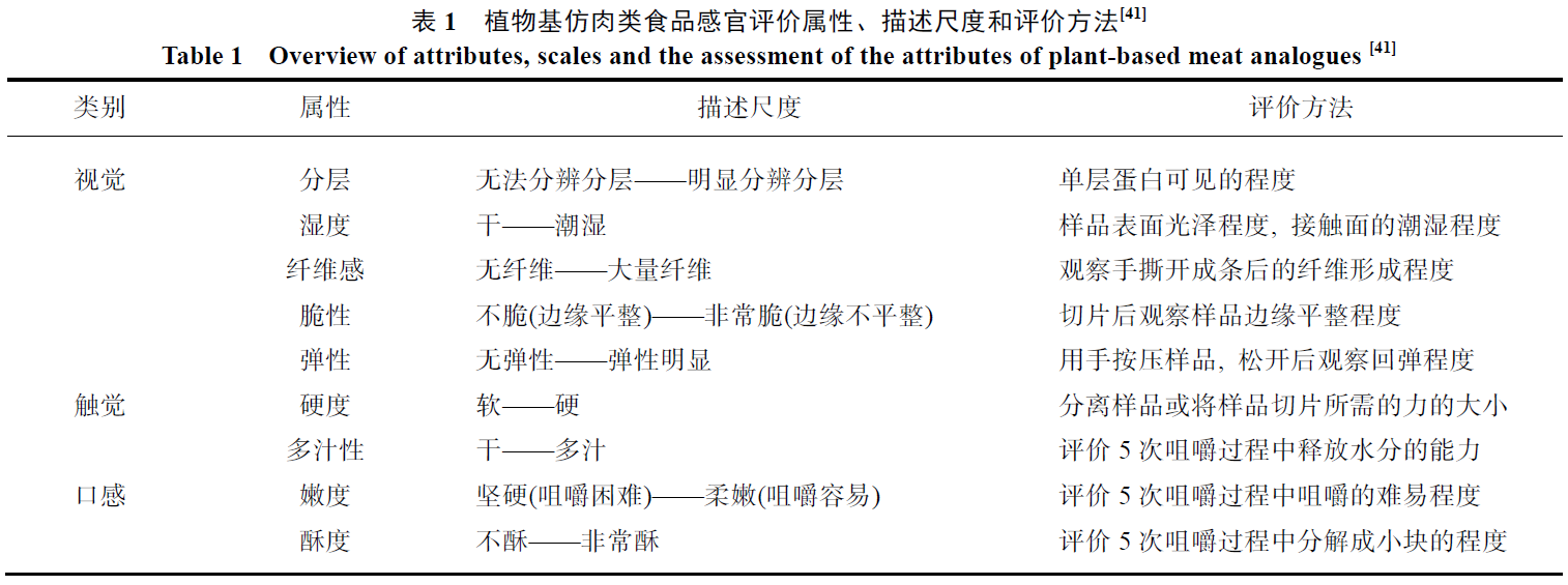 在感官评价中, 通常可以通过描述性分析对植物基仿肉类食品的外观与口感进行评价, 表1 给出了一些常见的评价指标, 参考Grahl等的方法略有修改。在感官评价小组的培训过程中, 需要制作有关于描述尺度的样本,以定义各描述尺度下确切的感官概念。