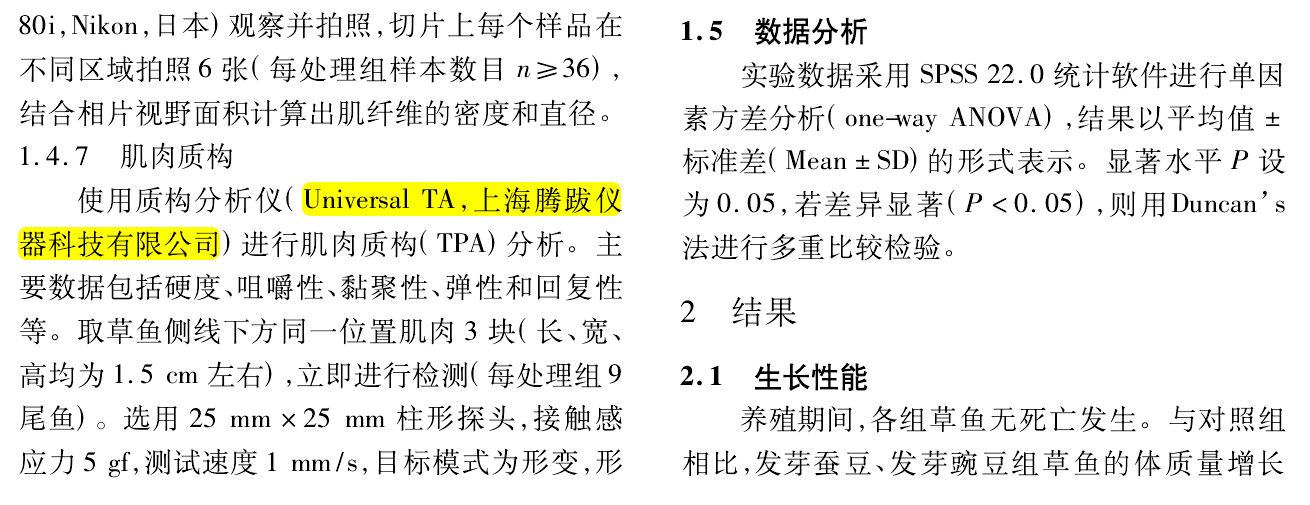 2020年,上海海洋大学水产科学实验教学示范中心研究人员在国内期刊《上海海洋大学学报》在线发表了题为“发芽蚕豆与发芽豌豆对草鱼生长和肉质影响的比较”的研究文章。在该论文中,研究人员使用上海腾拔仪器科技有限公司的Universal TA质构仪来测定草鱼肌肉的硬度、咀嚼性、粘聚性、弹性和回复性指标。