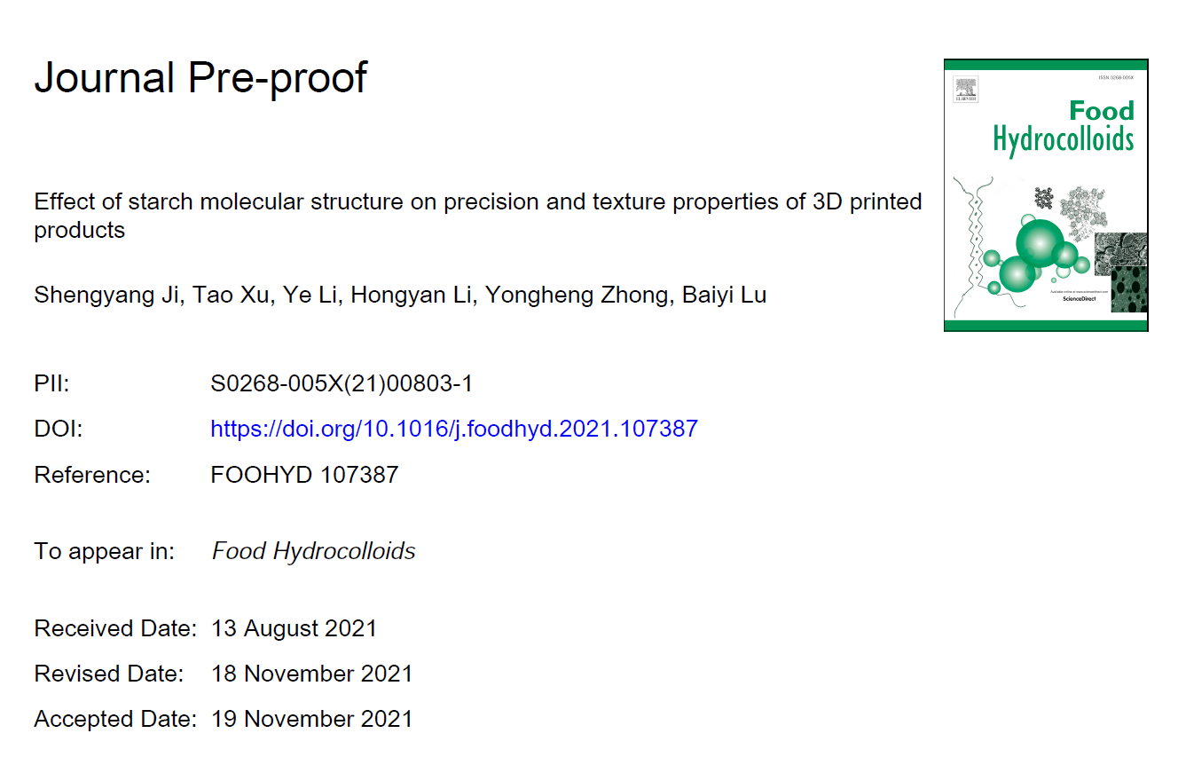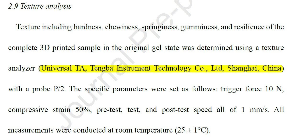 近日,浙江大学研究人员在国际食品期刊《Food Hydrocolloids》(IF=9.147)在线发表了题为“Effect of starch molecular structure on precision and texture properties of 3D printed products"的研究论文。在该论文中,研究人员使用上海腾拔Universal TA研究型质构仪测定3D打印样品的硬度、咀嚼性、弹性和回复性等指标。