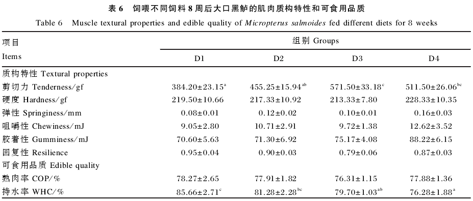各组大口黑鲈的肌肉质构特性和可食用品质见表 6。 不同饲料对大口黑鲈肌肉硬度、弹性、咀嚼性、胶着性、回复性和熟肉率的影响较少,各组间无显著差异(P>0.05)。 相比于D3 和 D4 组,D1、D2 组肌肉剪切力显著降低(P<0.05),肌肉持水率显著升高(P<0.05)。 上述结果说明含CProⅠ和CProⅡ饲料有利于提高大口黑鲈肌肉的嫩度。
