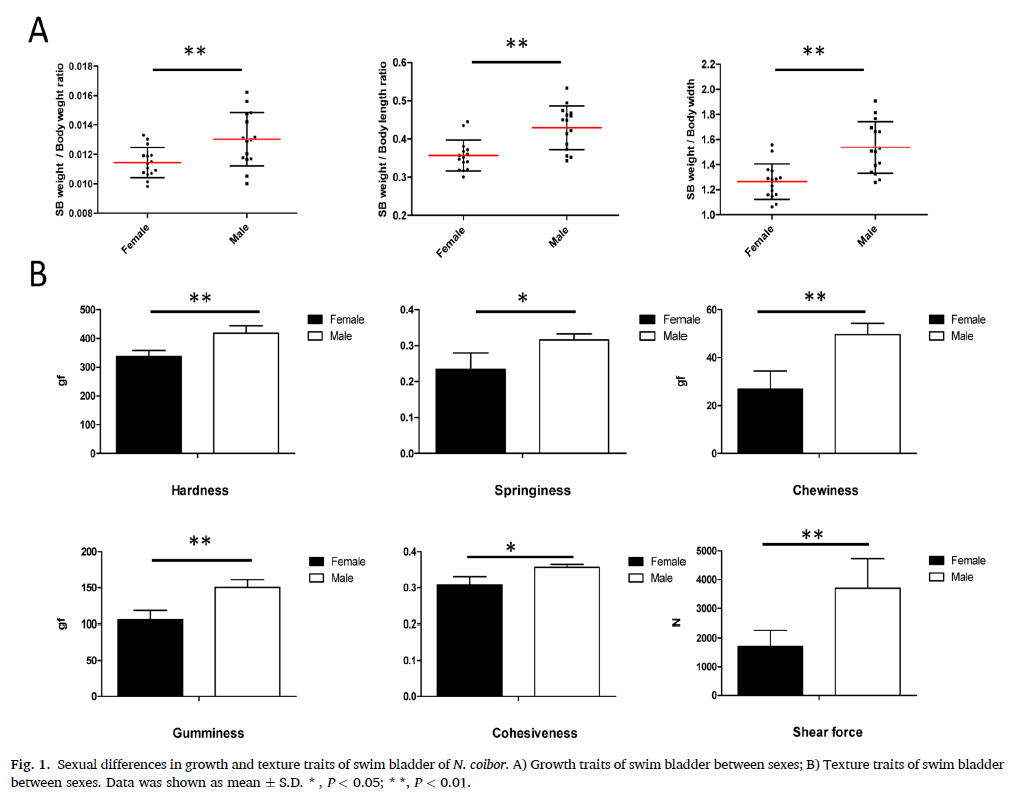 近日,汕头大学和华南农业大学研究人员合作在水产领域国际期刊《Aquaculture Reports》(IF=3.385)发表了题为"Sexual dimorphism in the texture properties of swim bladder of Nibea coibor and its molecular basis revealed by comparative transcriptome analysis"的研究论文。在该论文中,研究人员使用上海腾拔Universal TA研究型质构仪测定了浅色黄姑鱼的硬度、弹性、咀嚼性、内聚性和剪切力等指标。
