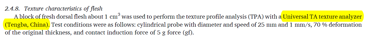 在该论文中,研究人员利用Universal TA质构仪测定草鱼幼鱼肌肉的硬度、粘附性、弹性、咀嚼性、内聚性和回复性。硬度、咀嚼性和回复性等质构特性是肌肉最重要的品质指标,可用于评价肌肉的可接受性和机械加工性。该研究结果表明饲料中添加0.8g/kg山柰酚可增加草鱼幼鱼肌肉的硬度、咀嚼性和回复性。