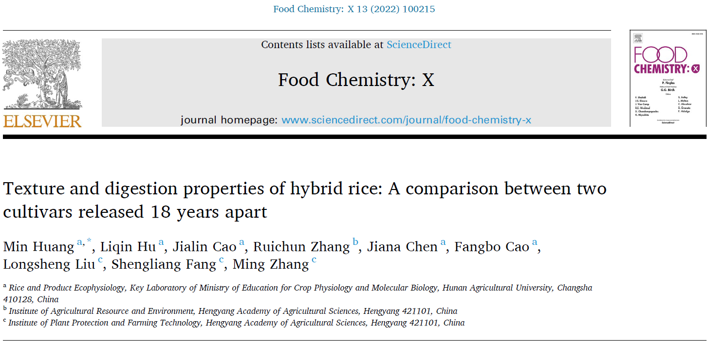 在该论文中,研究人员进行野外试验来对比两个杂交水稻品种--个是最近发布的高品质品种(Jingliangyou 1468, JLY1468)和一个相对更老的品种(Liangyoupeijiu, LYPJ)。质构仪测试结果表明JLY1468中熟精米的硬度、弹性、内聚性、回复性和咀嚼性都低于LYPJ,这是由于JLY1468精米粉更低的直连淀粉含量和改变的糊化特性的影响。相比LYPJ,JLY1468活性消化持续时间缩短26%,来自淀粉消化的葡萄糖产生率快33%。该研究强调我们应该关注与培育具有软质地的高品质杂交水稻品种相关的潜在健康风险。